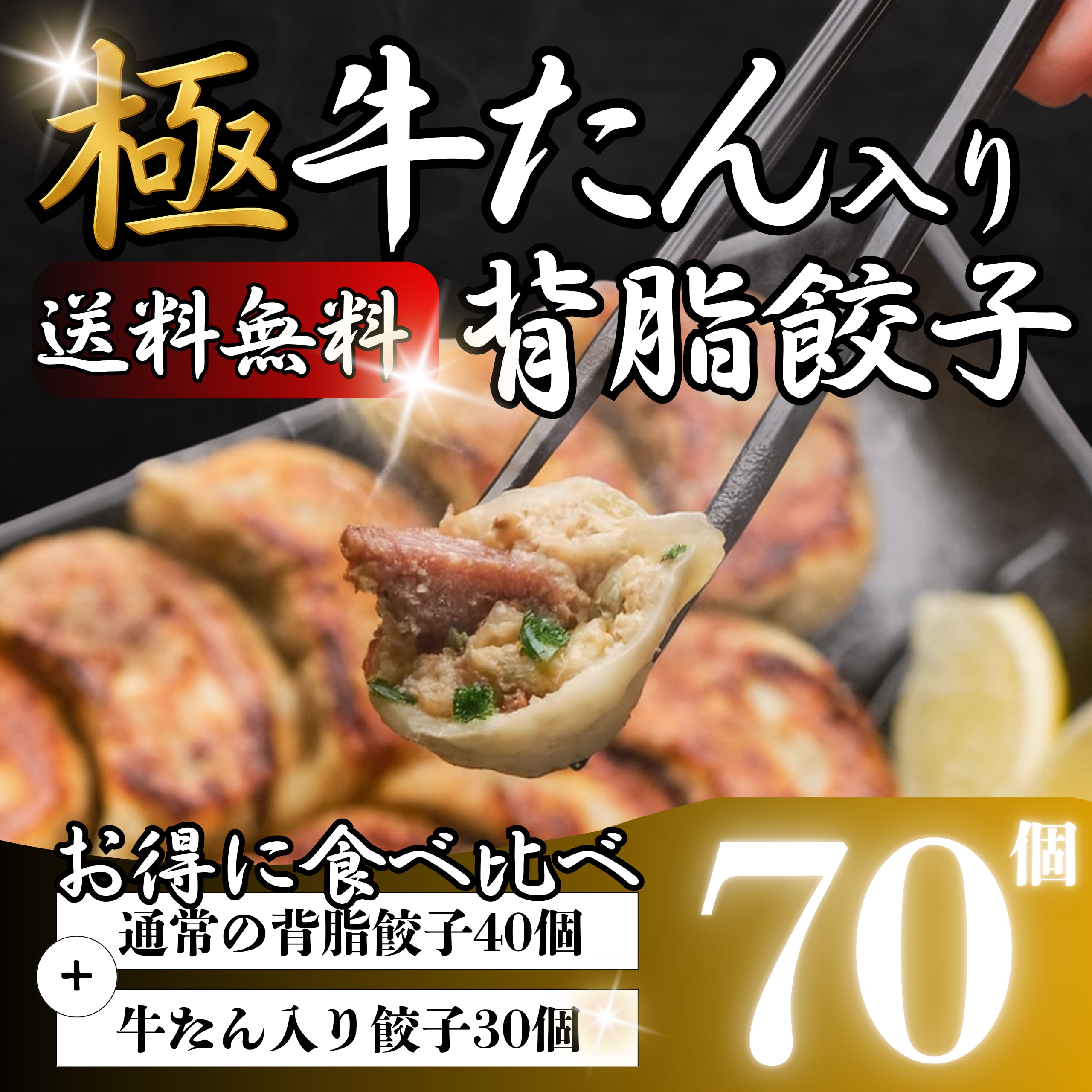 お買い得!! 送料無料!!【通常の背脂餃子40個+牛たん入り餃子30個=計70個】極 牛たん入り背脂餃子|ぴーきち商店オリジナル|2セット単位でお買い得